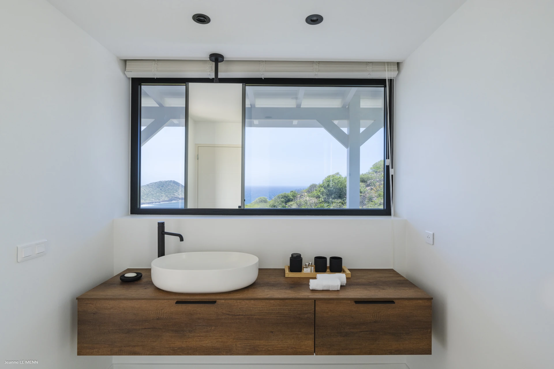The main terrace, accessible from the living area, hosts a sparkling heated pool surrounded by verdant lawns and shaded loungers, offering mesmerizing views of the bay and St. Barts' natural beauty. A covered section houses an outdoor dining area and cozy seating, perfect for unwinding with a cocktail in the Caribbean breeze. Additionally, a long-covered terrace at the front affords an exceptional panorama of the hillside and the endless expanse of the deep-blue ocean.